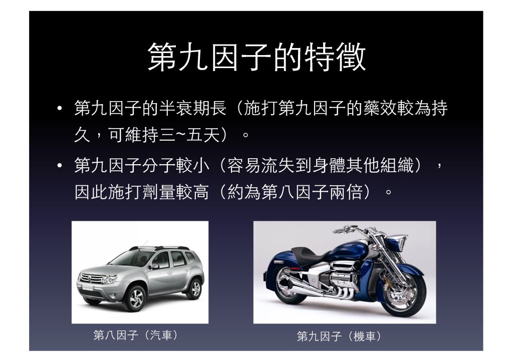 相較於A型血友病缺乏第八因子,B型血友病患者缺乏的是第九因子,第九因子分子量較小,可以分布在全身各個器官,也能離開血管,進入血管外的組織中,而第八因子則因為分子量大,因此只能在血管內循環。因此在傳統的凝血因子治療時,第九因子注射劑量是第八因子治療劑量的兩倍,就是因為第九因子會離開血管,與血管或組織中的膠原蛋白結合而使血液中濃度下降的緣故。