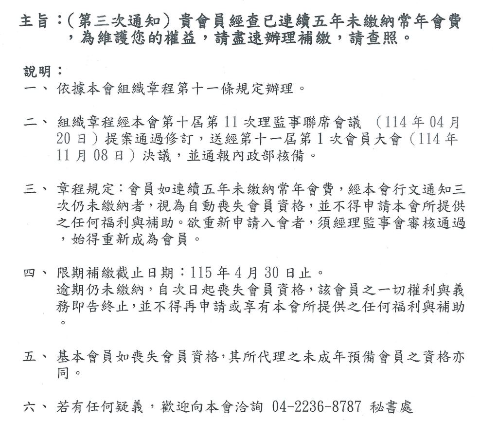 【第三次通知】連續五年未繳納常年會費,請盡速辦理補繳